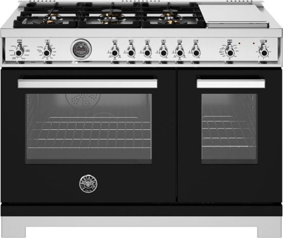 48” Dual Fuel range has 6 brass burners with electric griddle and features 2 dual ring 19,000 BTU power-burners, 4.6 cubic feet self-cleaning oven dual convection fan, 2.4 cubic feet auxiliary oven, 7 shelf levels, digital gauge, temperature probe, telescopic glides, soft-close doors, air-frying mode. All Bertazzoni appliances are covered by a 2-year warranty.