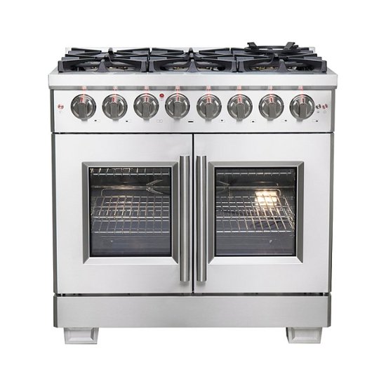 Loading... Please wait...This professional style Capriasca 5.36 Cu. Ft. Freestanding Dual Fuel Range with French Doors will bring your home kitchen to life with its durable and sleek stainless-steel double oven design. Discover the benefits of this unique French door design-the doors easily open simultaneously using just one hand so you can place your cookware in the oven with ease. The French doors take up to 12" less open-door space and will afford you more freedom and safety to move around as you meal prep-all your kitchen dreams come true! The cooktop features 6 Italian sealed brass burners with a powerful total stove top output of 120,000 BTU. This dual fuel range is equipped for the multitasking it takes to prepare large meals and has the capacity to handle all your pots and pans with ease on the continuous heavy-duty cast-iron grate design. The 5.36 cu. ft. gas oven with a total output of 6,300 watts is encased in a blue enameled interior and fitted with a true convection fan to ensure fast, precise, and consistent oven cooking. A 3-layer glass oven door window allows for easy viewing so you can keep an eye on that delicious meal as it’s cooking. 3 telescopic oven racks, a concave wok-ring, reversible griddle, air fry rack, drip pan and LP conversion kit are included with this impressive all-in-one model. Housed in a high-grade 304 and 430 stainless steel body with robust zinc knobs, this unit sports a stylish look and unmatched quality that is built to last. For your satisfaction, all Forno products are backed by an iron clad 2-year warranty. A cooking solution that showcases the harmony of style meeting function-skip the high price tags without sacrificing quality and performance and lower the cost of living with Forno.