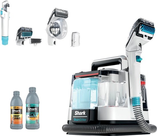 New ProductsThe Shark StainStriker is a portable spot & stain eliminator that delivers unbeatable tough stain elimination, with no premix required‡ Dual-activated solution unleashes the power of OXY delivering 20X more stain-striking power*. Tackle food stains, spills, embedded dirt, & pet messes throughout your home: carpets, area rugs, couches, upholstery & more.